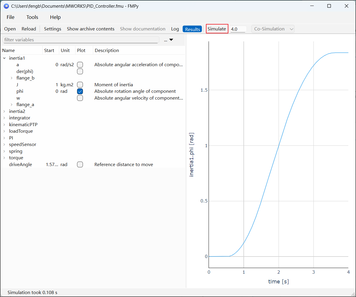 FMU 验证通过后,还可以使用 FMPy 进行仿真。单击【Simulate】即可启动仿真;在左侧变量列表中勾选所需变量,右侧将显示对应的结果曲线。