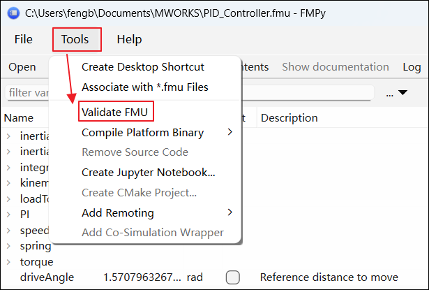 单击 Tools > Validate FMU 即可验证 FMU: