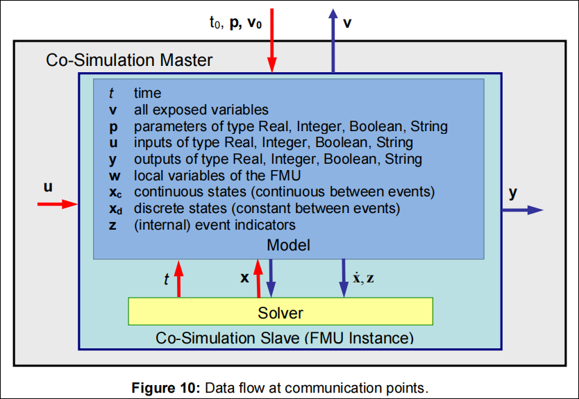 Co-Simulation 类型的 FMU 求解示意图如下所示(图片来源:Functional Mock-up Interface Specification 2.0.4, Page 99 of 132):