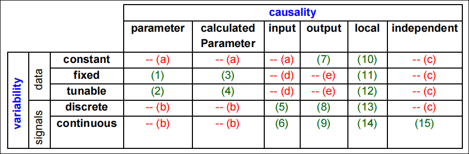 ModelVariables:FMU 的核心数据结构,定义了 FMU 向外暴露的所有变量信息。示例:<ModelVariables> <ScalarVariable name="driveAngle" valueReference="848" description="Reference distance to move" variability="tunable" causality="parameter" initial="exact"> <Real quantity="Angle" unit="rad" start="1.570796326794897"/> </ScalarVariable> <!-- index = 1 --> <ScalarVariable name="PI.u_s" valueReference="6017" description="Connector of setpoint input signal"> <Real/> </ScalarVariable> <!-- index = 2 --> </ModelVariables>ModelVariables元素由一组有序的ScalarVariable元素组成,name:变量的全局唯一全名;valueReference:仿真工具高效访问 FMU 内部变量值的唯一标识;description:描述变量具体含义的字符串;causality:变量的因果性,其取值与变量的可变性variability密切相关。二者的取值需遵循以下允许的组合规则(图片来源:Functional Mock-up Interface Specification 2.0.4, Page 51 of 132):