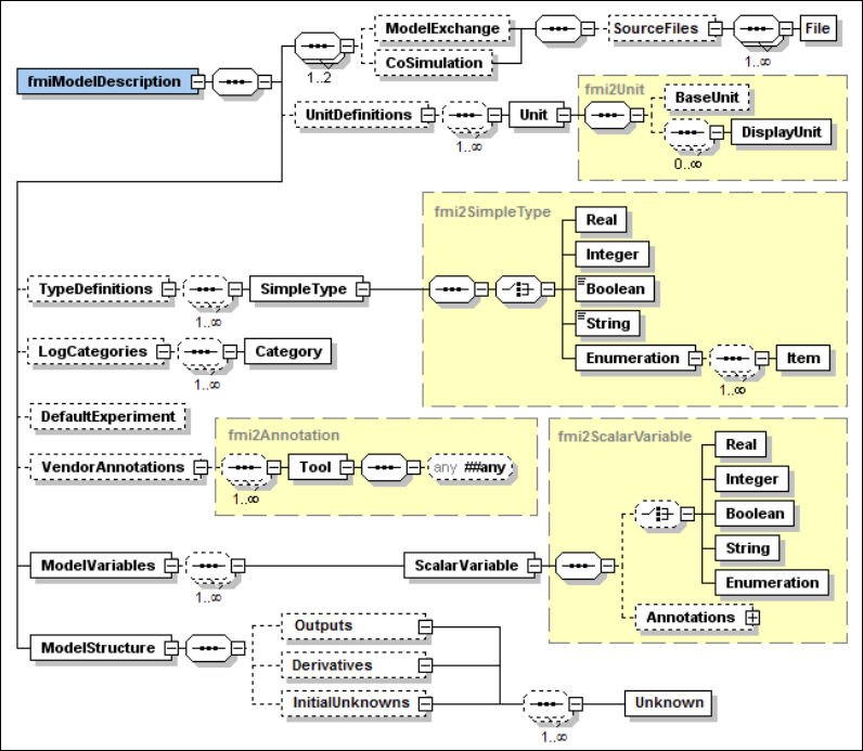 FMU 核心功能的所有静态信息均存储于模型描述文件modelDescription.xml中,所有的 FMU 必须包含该文件。下图展示了 FMI 2.0 规范中modelDescription.xml文件的根级架构定义(图片来源:Functional Mock-up Interface Specification 2.0.4, Page 31 of 132):