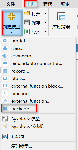 在 Sysplorer 主页面顶部的主页页签,选择新建模型>package。