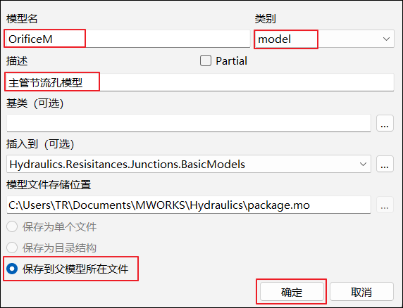 在弹出对话框对应位置填入:模型名称“OrificeM”;类别“model”;描述“主管节流孔模型”;勾选保持到父模型所在文件,其他默认,单击确定,创建主管节流孔空模型。