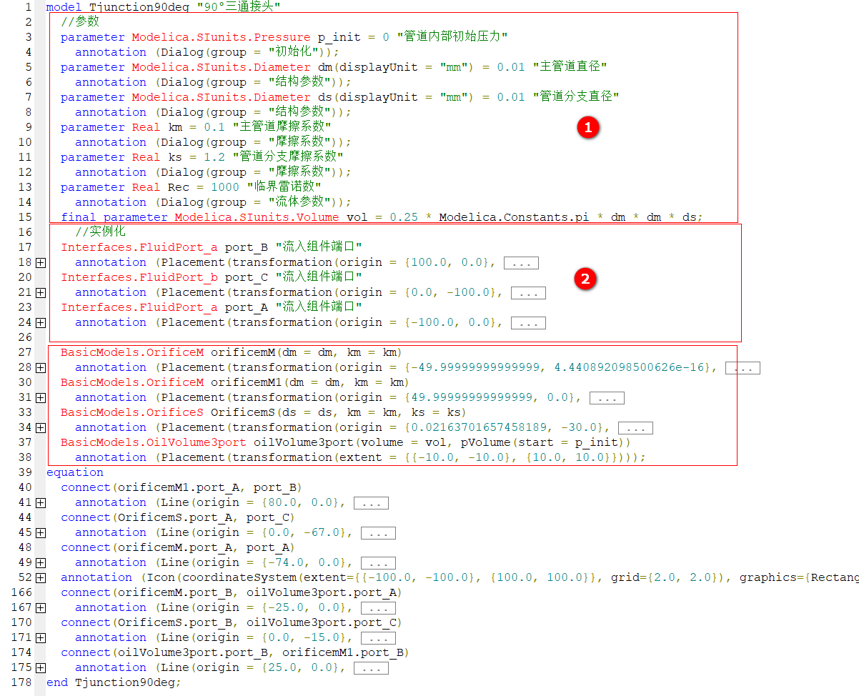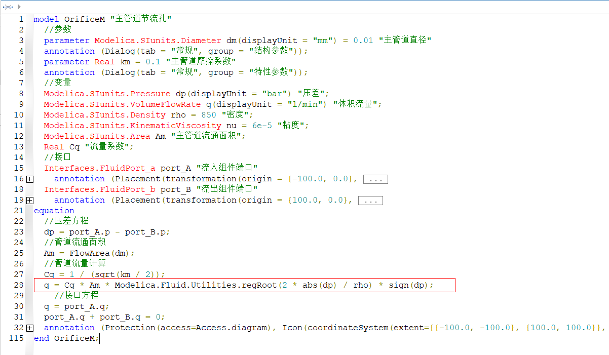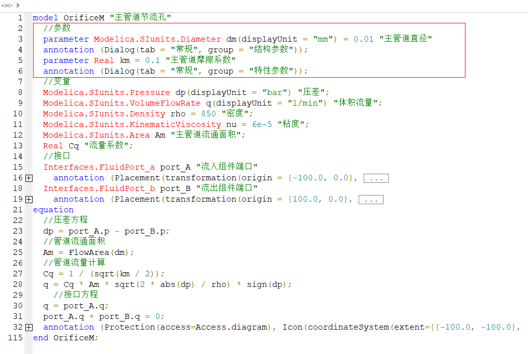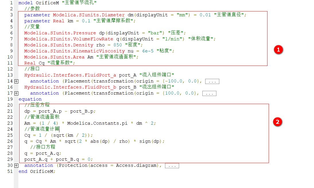 进入文本视图,对主管节流孔模型按照继承类语句、模型参数、模型变量、模型接口和模型方程等规范顺序进行对应代码写入。