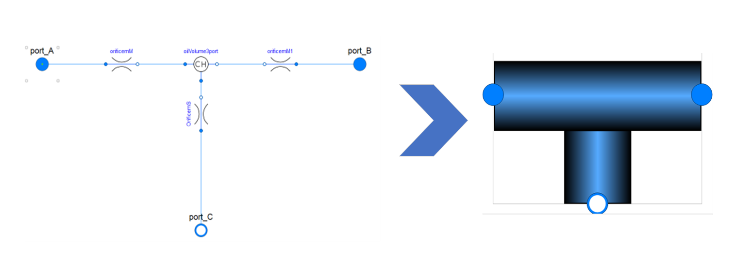 最终将完成的主管节流孔、分支管道节流孔和三接口液压容积进行封装组合成完整的三通模型,如下: