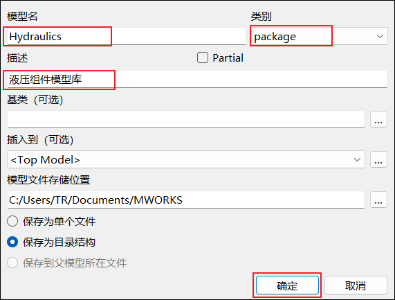 在弹出对话框对应位置填入:模型库名称“Hydraulics”;类别“package”;描述“液压组件模型库”;其他默认,单击确定,创建液压组件空模型库。