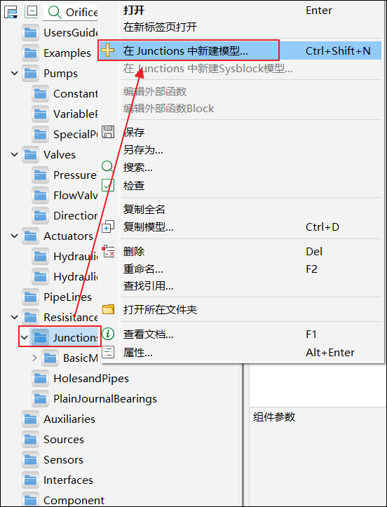 Hydraulic.Resisitances.Junctions路径下的子模型库,并创建新模型,右击 Junctions 弹出对话框,单击在 Junctions 中新建模型…。