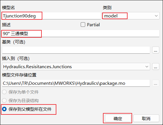 在弹出对话框对应位置填入:模型名称“Tjunction90deg”;类别“model”;描述“90° 三通模型”;勾选保持到父模型所在文件,其他默认,单击确定,创建 90° 三通模型空模型。