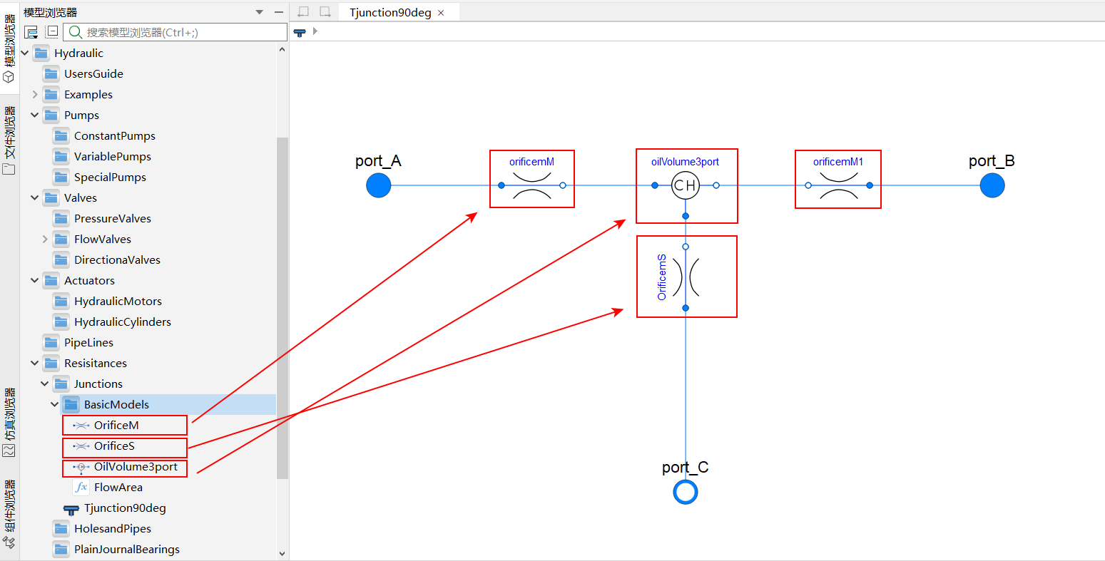 ,进入图形视图,在图形视图中依次拖 2 个 OrificeM 主管节流孔、1 个 OrificeS 分支管道节流孔、1 个 OilVolume3ports 三接口液压容积等基础模型,然后创建 90° 三通模型接口,最后进行合理布局和连线,以完成建立 90° 三通模型所必须的模型构建,如图所示;