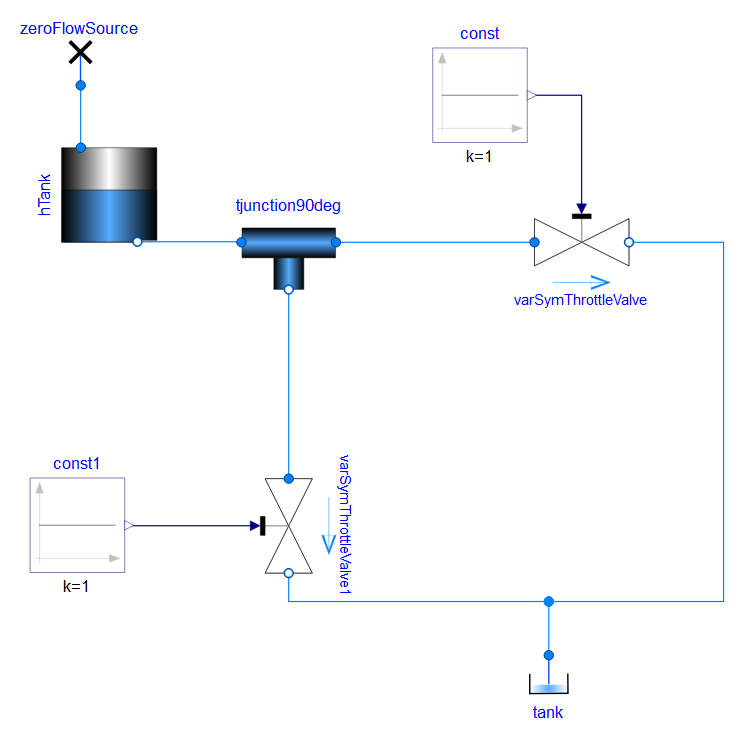 这里搭建一个测试系统对模型进行测试,以下为油箱泄油系统,包括一个闭式油箱 hTank、一个零流量源 ZeroFlowSource、一个三通模型 Tjunction90deg、两个可变节流阀 VarThrottleValve 和一个开式油箱 Tank,主要实现通过可变节流阀 VarThrottleValve 控制闭式油箱 hTank 的油液高度变化和流出时体积流量变化。