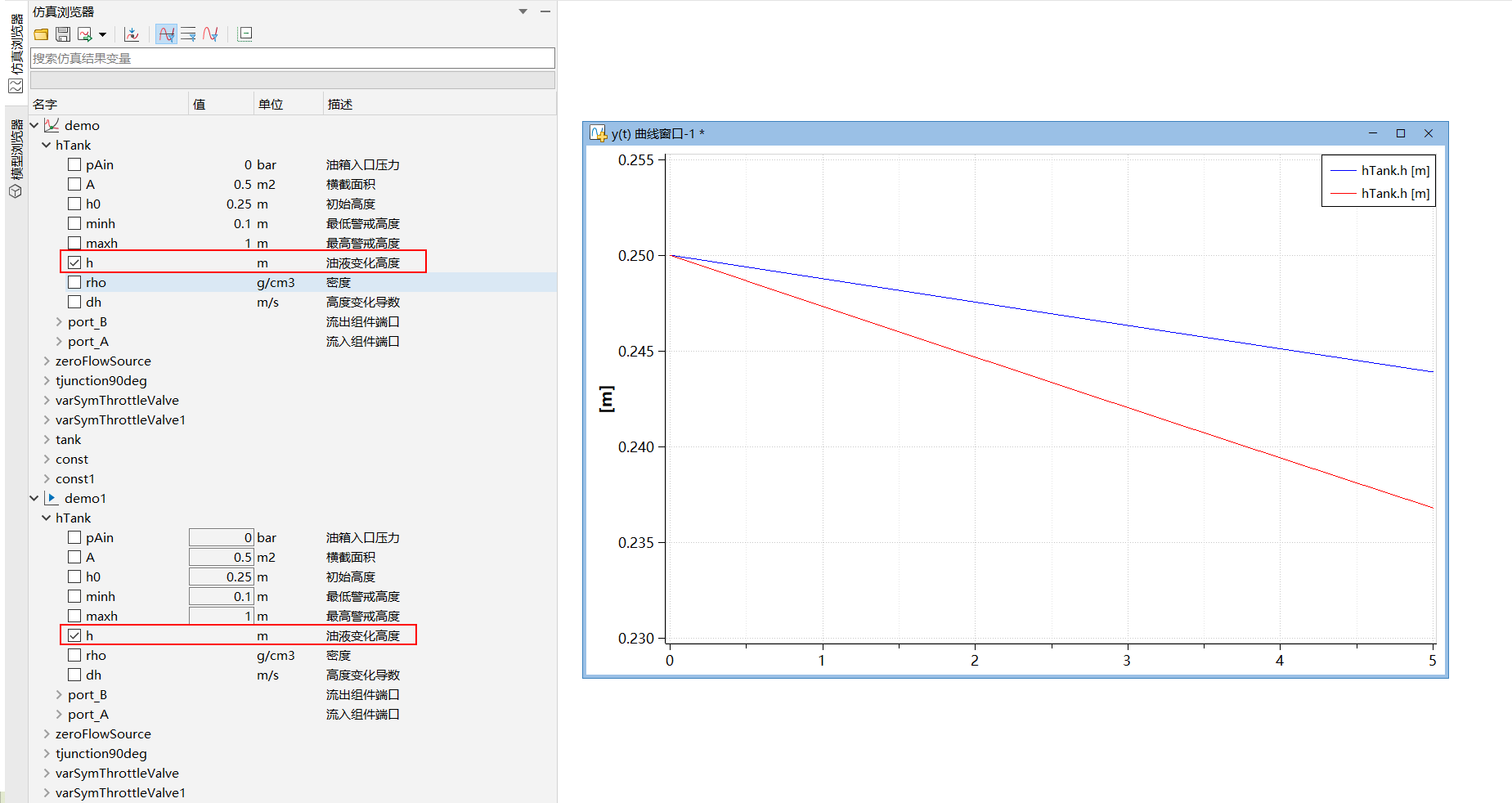 从上图可以看出,在只开一路可变节流阀 VarThrottleValve 时相比开两路,hTank 的油液高度变化更平缓,流出时体积流量更小。