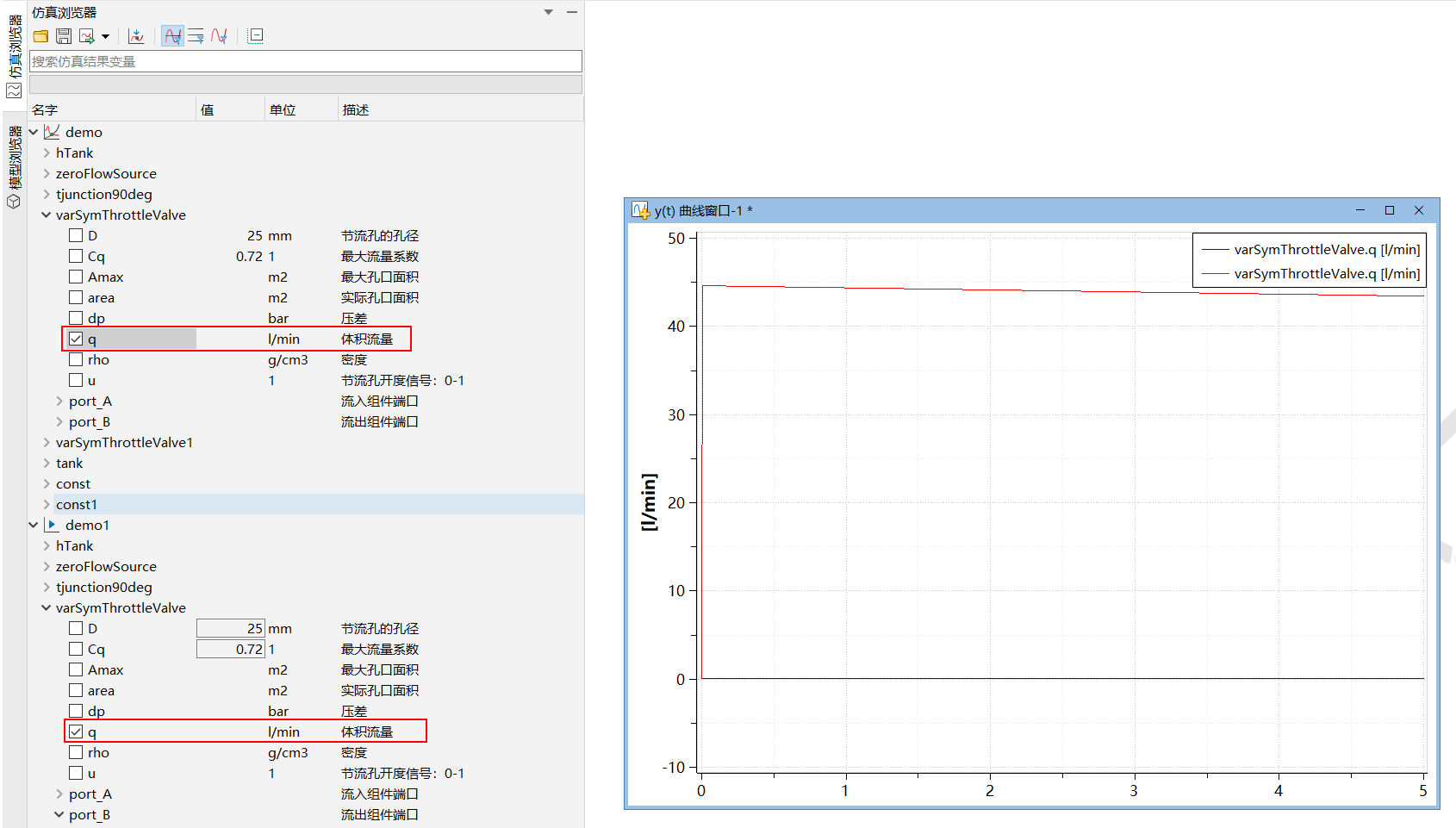 对 demo 和 demo1 分别进行仿真操作。其中 demo 为开两路可变节流阀 VarThrottleValve,demo1 为在只开一路可变节流阀 VarThrottleValve。