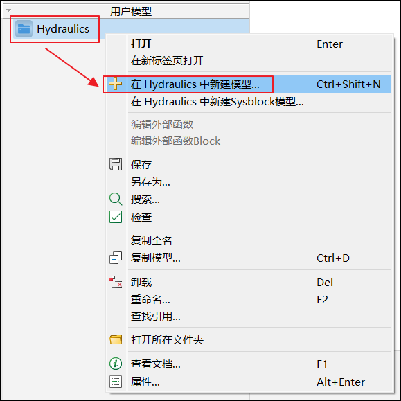 在液压组件空模型库创建新模型,右击 Hydraulics 弹出对话框,单击在 Hydraulics 中新建模型…。
