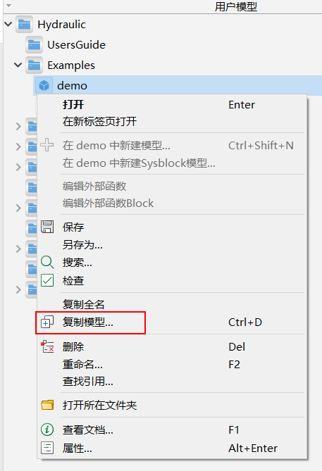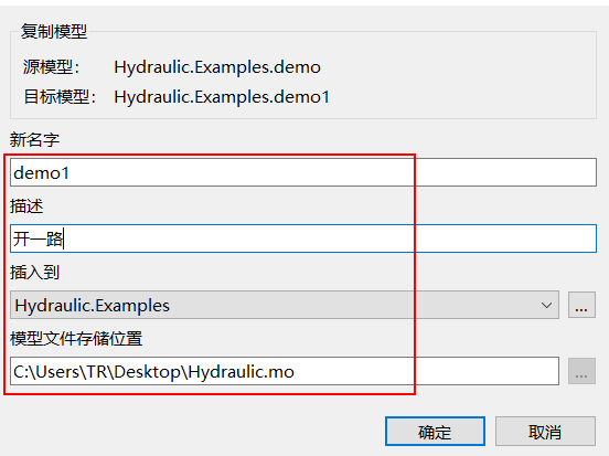 在复制弹框中,新名字输入“demo1”,描述“开一路”,插入到选择 Hydraulic.Examples,单击确定,完成模型复制。