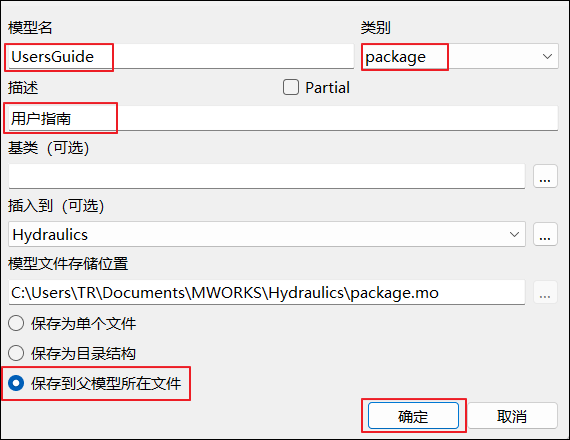 在弹出对话框对应位置填入:模型子库名称“UsersGuide”;类别“package”;描述“用户指南”; 勾选保持到父模型所在文件,其他默认,单击确定,创建用户指南空模型子库。