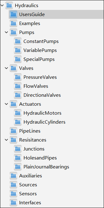 | Actuators | 执行机构库 | 液压马达库(HydraulicMotors) | 提供了单向、双向和双向外排等定量马达以及单向、双向和双向外排等变量马达 |