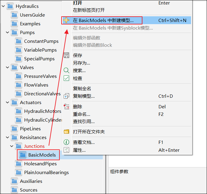 Hydraulic.Resisitances.Junctions.BasicModels路径下的子模型库,并创建新模型,右击 BasicModels 弹出对话框,单击在 BasicModels 中新建模型…。