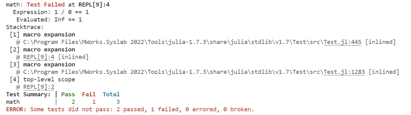 @testset "math" begin @test 1 + 1 == 2 @test 1 - 1 == 0 @test 1 / 0 == 1 end其中,不通过的测试会被标记为 Fail,此时要么是测试代码没写对,要么是对应的功能存在 bug。