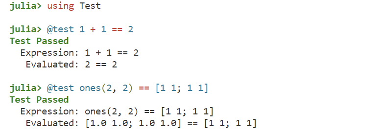 using Test @test 1 + 1 == 2 @test ones(2, 2) == [1 1; 1 1]