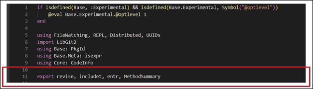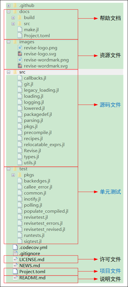 一个标准的包(如 Revise),其目录结构如下图所示: