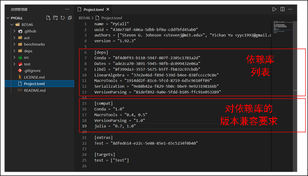 name = uuid; - [compat]:该库对依赖库的版本兼容要求。关于 compat 字段的规则,请参考 http://pkgdocs.julialang.org/v1/compatibility/ (opens new window)。典型的写法是: