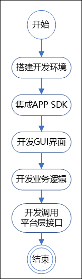 开发 APP 的具体过程包括编写代码开发 GUI 图形用户界面,开发具体的业务逻辑,实现与平台层的数据交互,调用平台层接口实现具体的业务逻辑。APP 的开发过程如下所示: