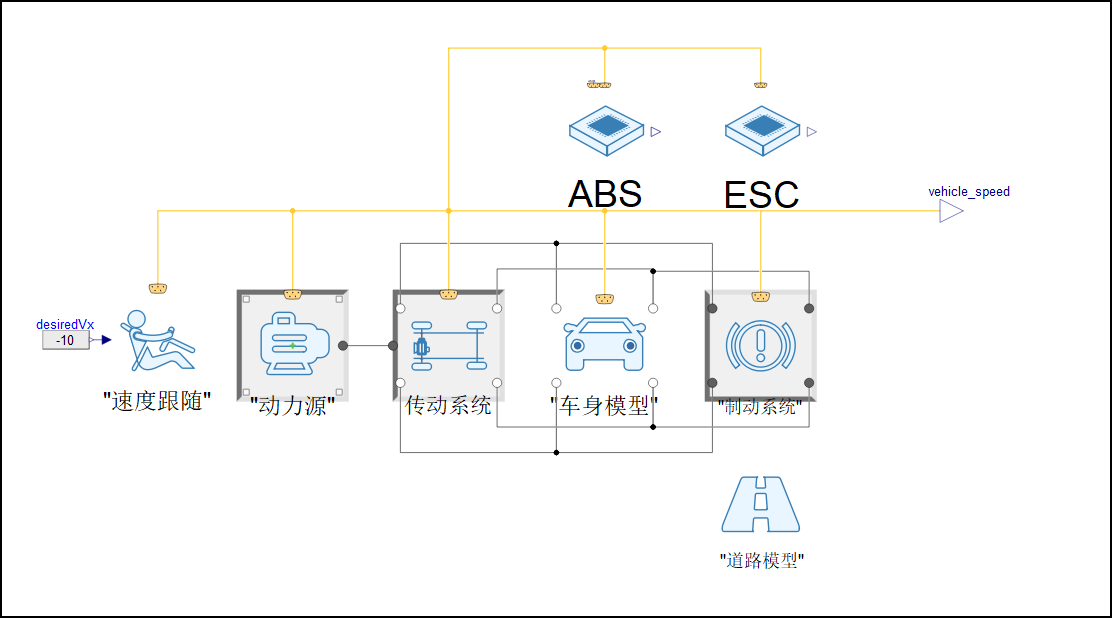 速度跟随模型内置于 Sysplorer 的车辆动力学模型库中,基于车辆动力学原理和控制理论,使车辆能够按照预定的速度跟随给定的参考速度。该模型通常应用于自动驾驶系统、巡航控制和交通流控制等。模型如下图所示: