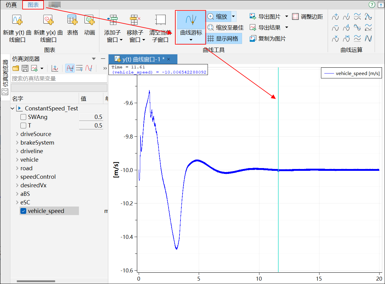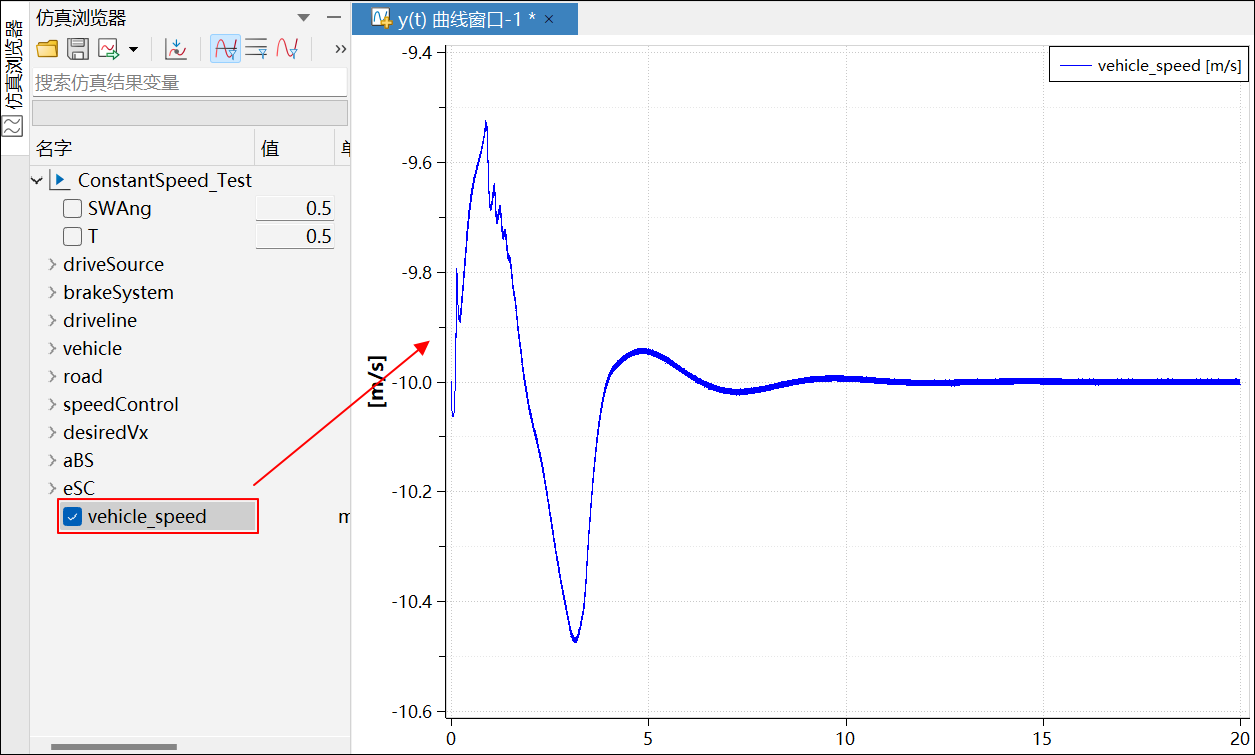 单击仿真,仿真结束后,在结果查看器左侧的仿真浏览器中单击 vehicle_speed,查看生成的速度曲线;