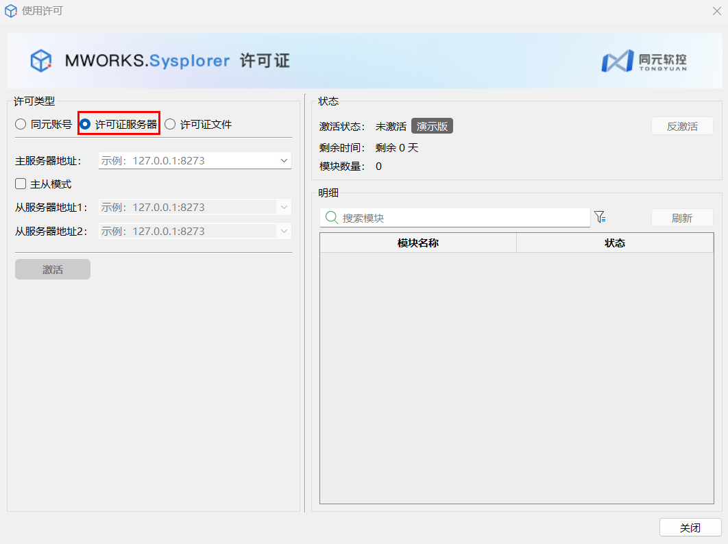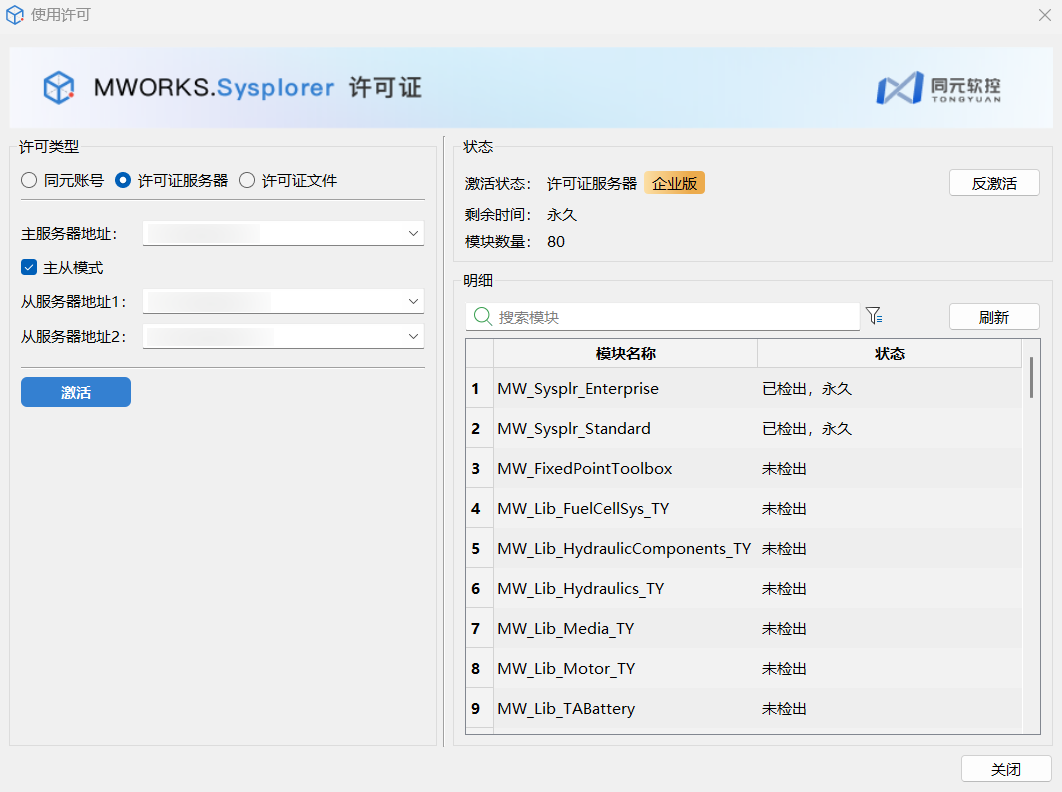主服务器地址输入正确的 ip 和端口号,单击激活,完成许可证服务器设置。