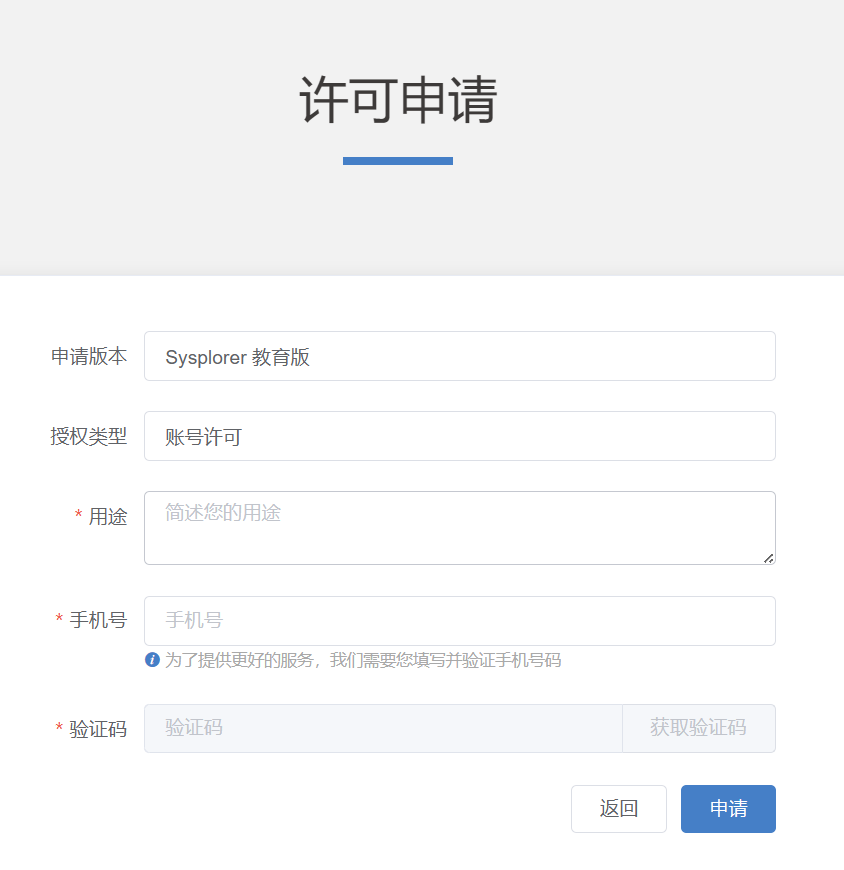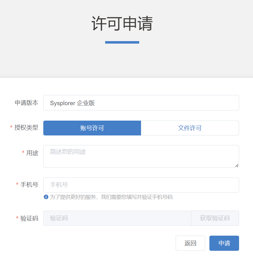 许可申请界面下,单击企业版-申请试用,打开许可申请详情页面。
