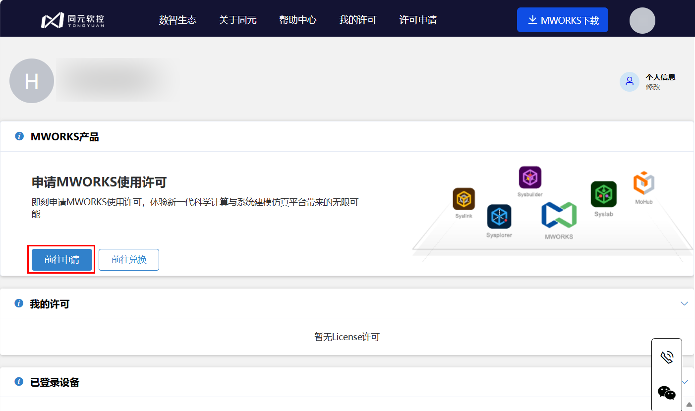 许可中心页面,单击前往申请,打开许可申请界面。