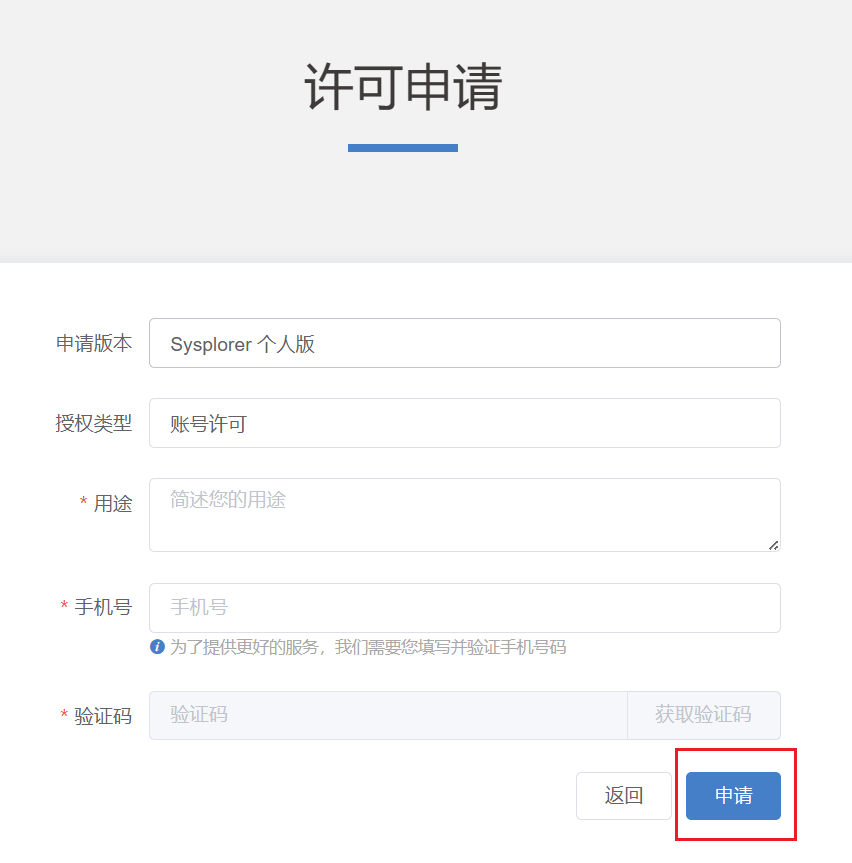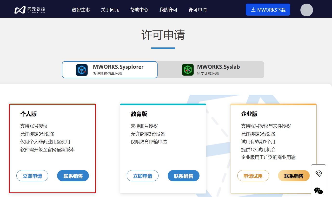 许可申请界面下,单击个人版-立即申请,打开许可申请详情页面。