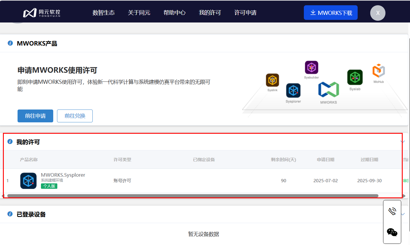 申请成功后,自动跳转至“许可中心”页面,在我的许可中查看当前账号绑定的许可信息。