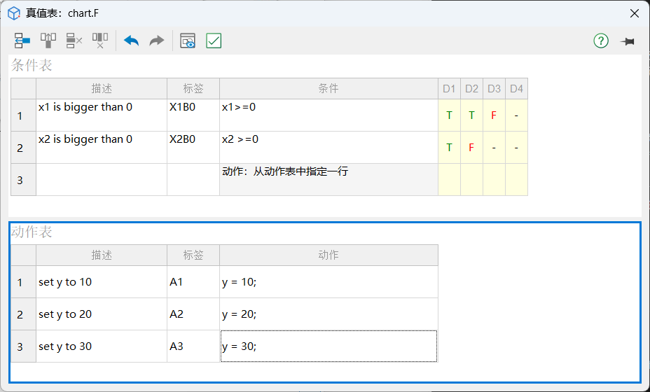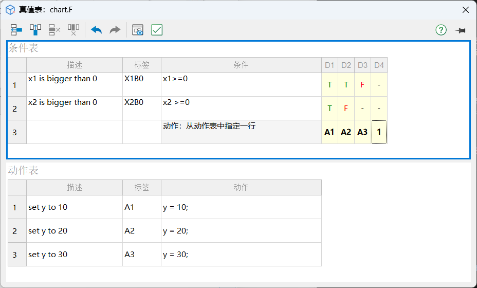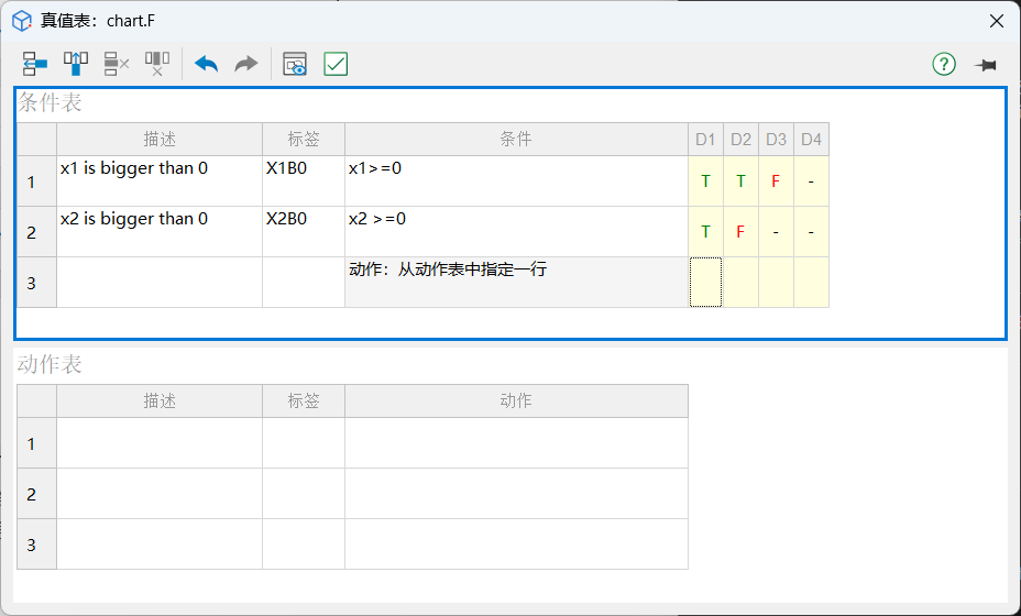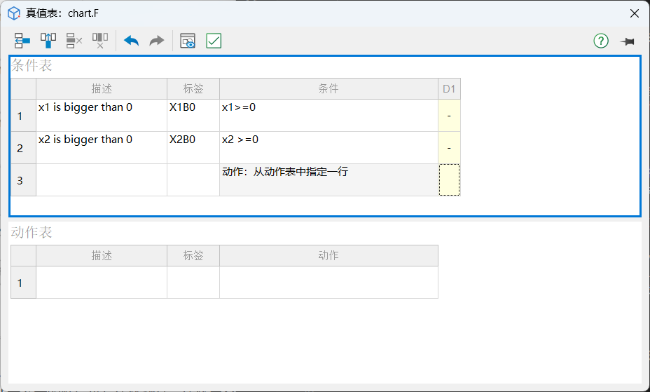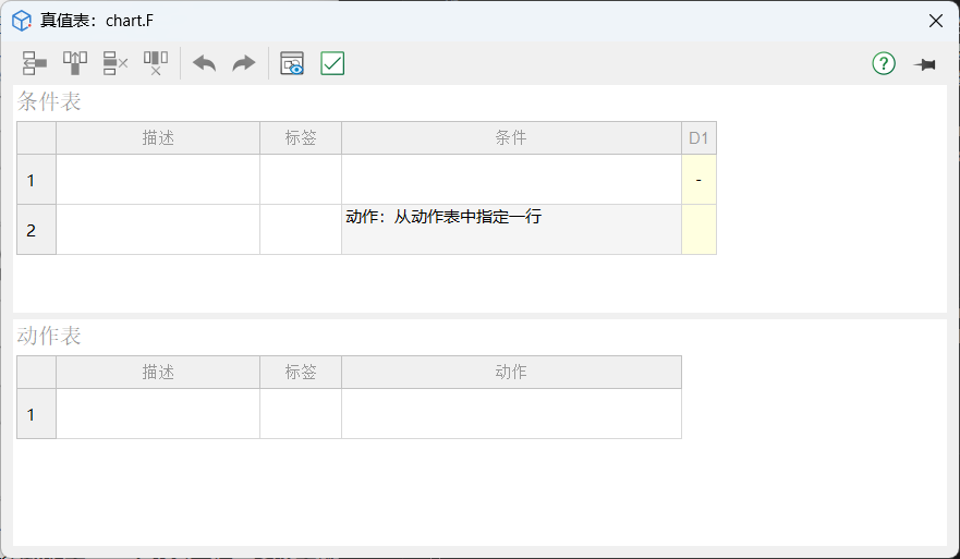 双击真值表函数,即可打开真值表对话框。默认情况下,真值表包含一个条件表和动作表,二者各有一行。条件表还包含一个决策列 D1 和一个动作行。