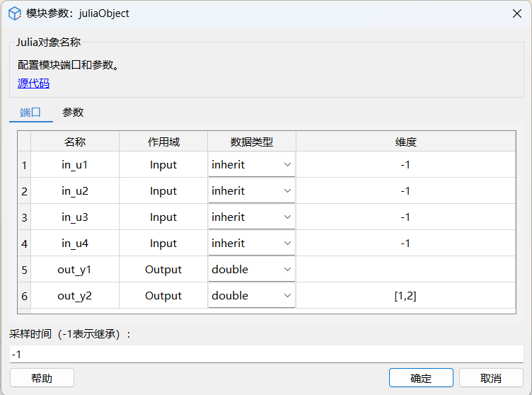 双击 JuliaObject 模块,将弹出 JuliaObject 模块参数对话框。在参数对话框中,您可以跳转源代码、对模块的端口和参数进行配置。