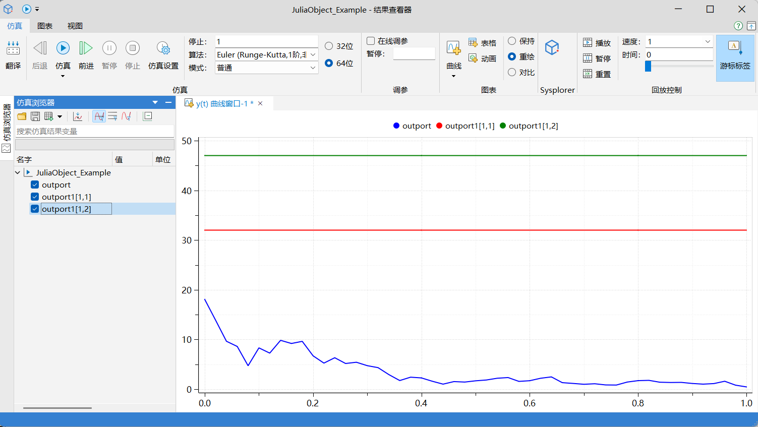 - 在修改 Julia 对象脚本并保存后,对应的框图模块不能直接进行仿真,需要进行打开参数对话框或单机对话框的确定按钮操作,使框图模块同步 Julia 对象脚本修改内容。