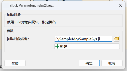 当您在 Syslab 中完成了 Julia 对象的编辑并保存后,Julia 对象脚本文件的选择弹框将自动填入对应 jl 文件的路径。此时选择确定,即完成了 JuliaObject 模块与 Julia 对象文件的绑定。
