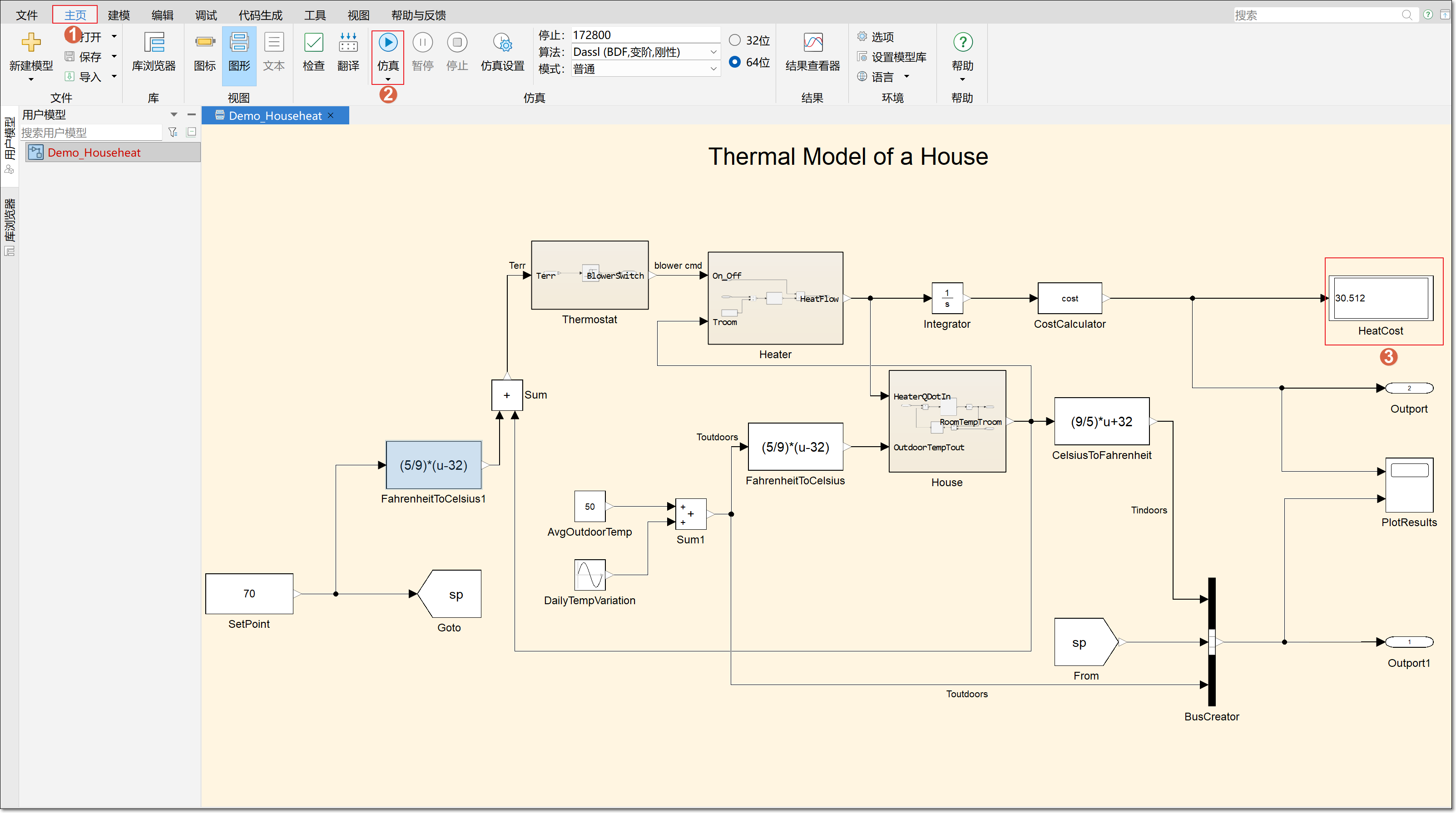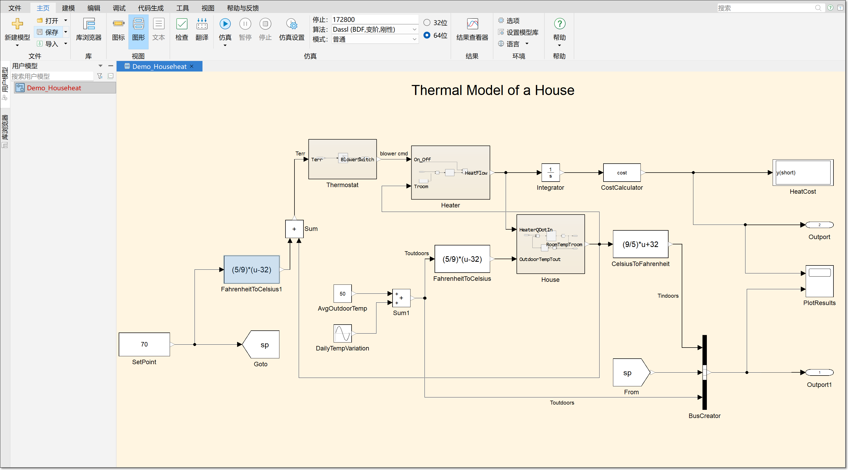 其中 Set Point 模块用来指定室内需要保持的温度,默认为 70ºF(华氏度);Heater 子系统模拟恒定的空气流速,以默认的 1 千克 / 秒流速吹出 50ºC(122ºF)的热空气;House 子系统用来计算室温的变化,它同时考虑加热器的热流和环境中的热损失;AvgOutdoorTemp 和 DailyTempVariation 模块用来模拟室外平均气温和每日温度波动,以用来模拟房屋的散热系统;CostCalculator 模块用来计算热流随时间的变化并乘以能量成本,从而得出加热成本。