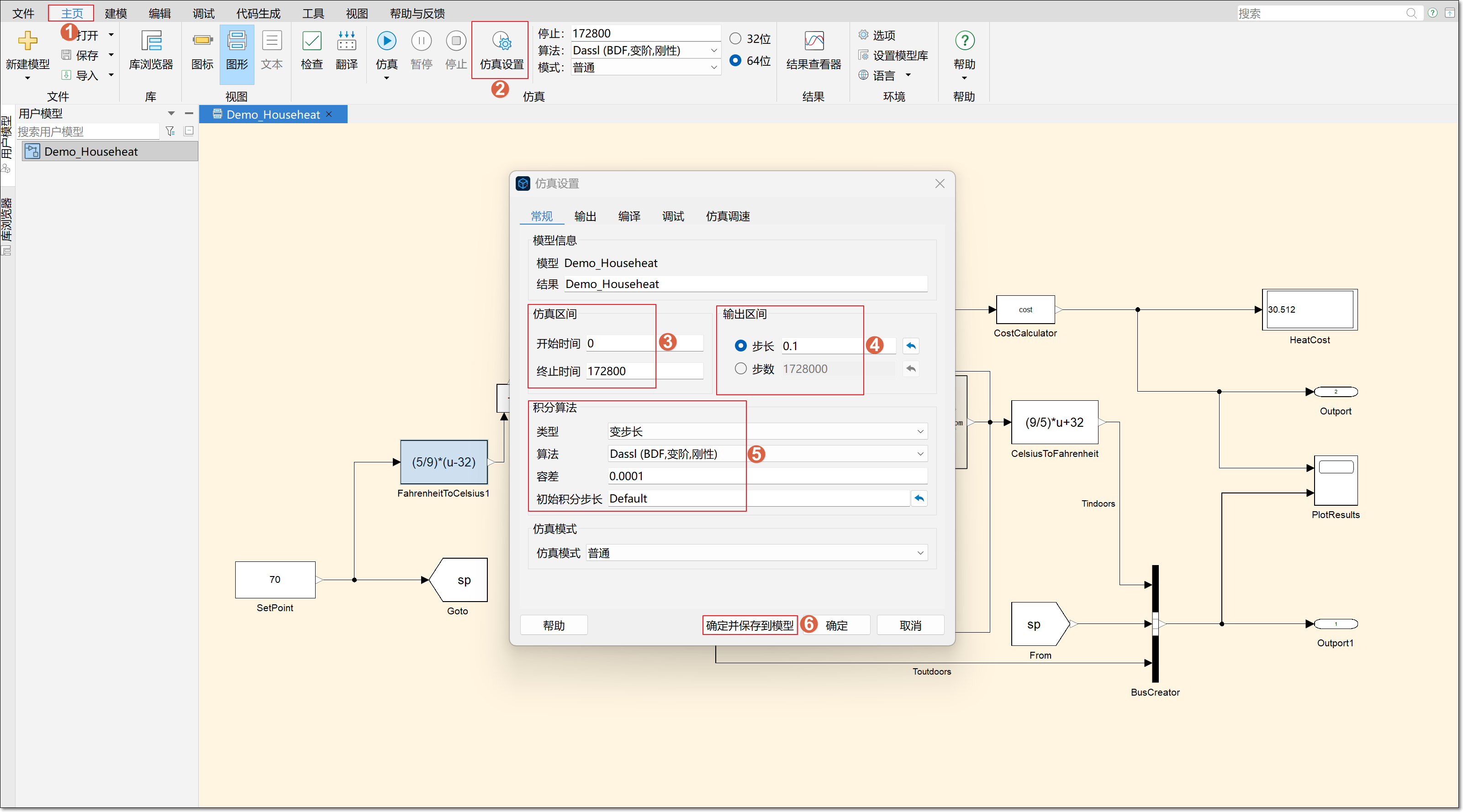 因此在进行仿真之前需要进行仿真设置,在软件上方功能区,单击主页 > 仿真设置按钮,打开仿真设置界面。在该界面设置开始时间 0,终止时间 172800,输出区间步长 0.1。积分算法的类型设置为变步长,算法为 Dassl(BDF,变阶,刚性),容差 0.0001,初始积分步长 Default,单击确定并保存到模型。