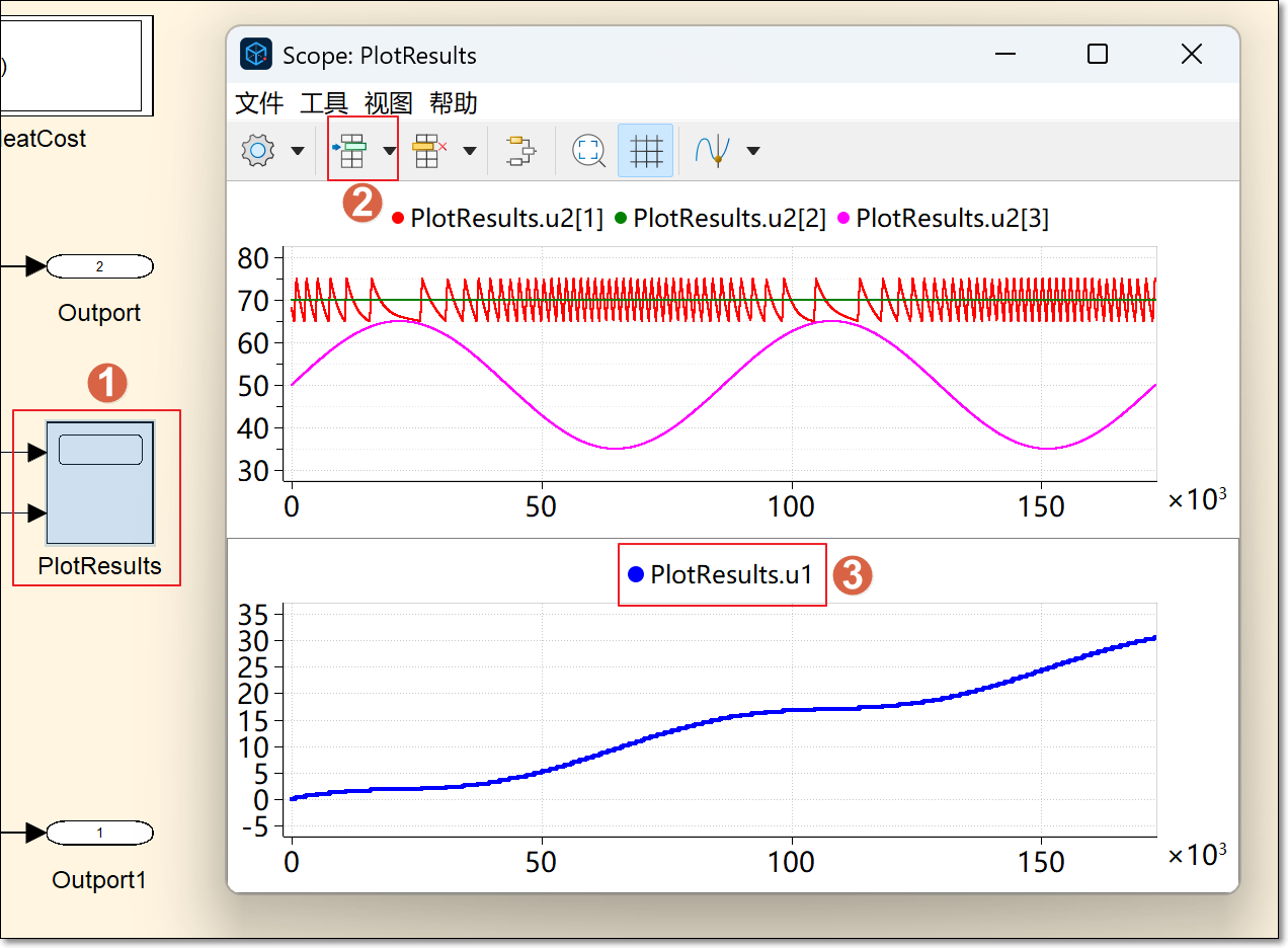 双击打开 PlotResults 模块,单击添加子窗口,再单击 PlotResults.u1 并且长按左键拖拽至新建的子窗口。