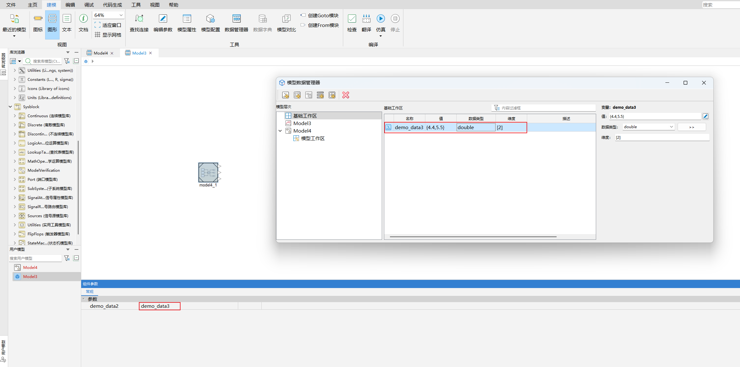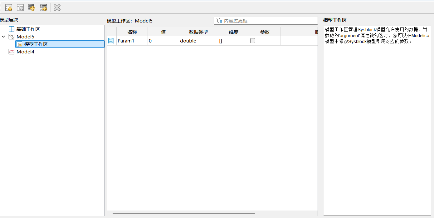 模型工作区是与特定 Sysblock 模型关联的工作区。每个 Sysblock 模型都有一个独立的工作区,用于存储和管理该模型特有的变量,这些变量通常用于模型参数化。模型工作区中的变量只对当前的模型可见,不会影响基础工作区。