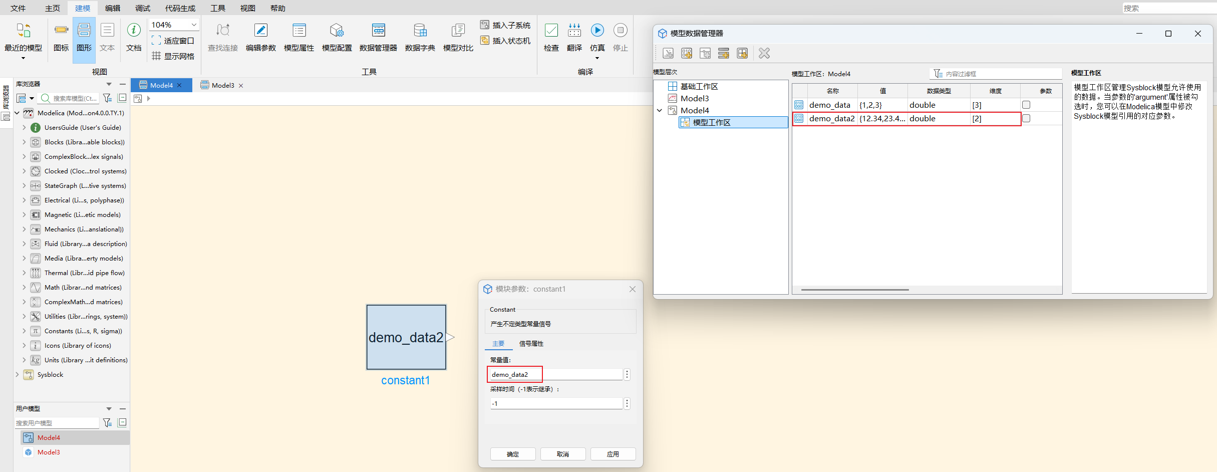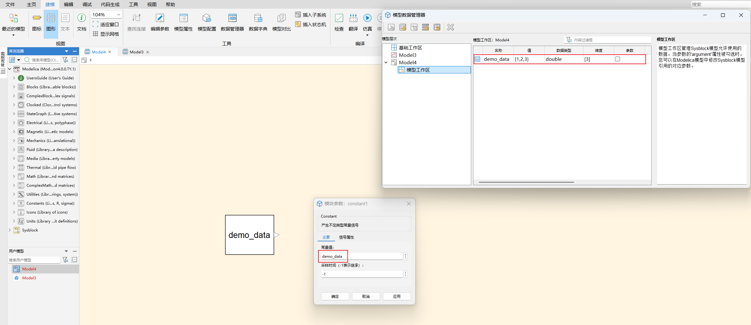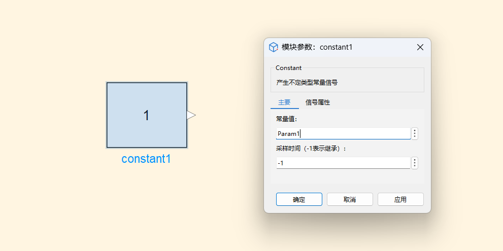 参数传递:模型工作区中的变量可以通过参数设置传递给 Sysblock 模型中的模块,例如常量块的值、Gain 块的系数等。