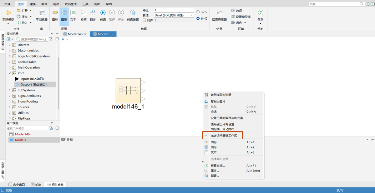 和 Sysblock 模型不同,物理模型只能使用基础工作区数据,并且要在图形视图的右键菜单中勾选允许访问基础工作区选项。