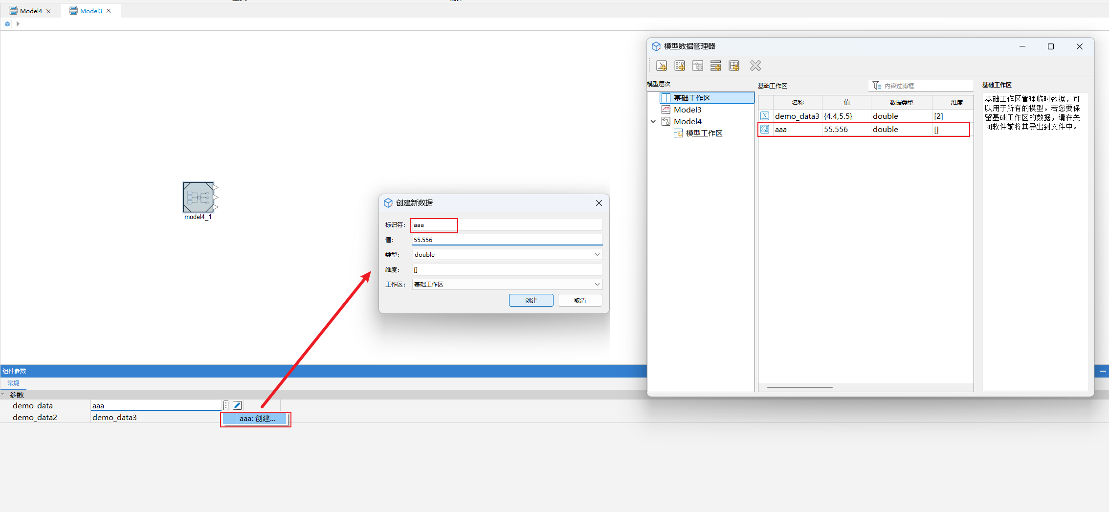 勾选模型工作区的数据的参数属性,即可在模型引用中修改对应数据的值: