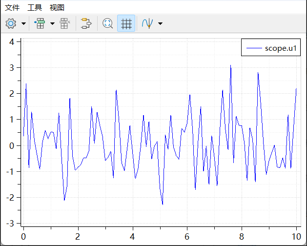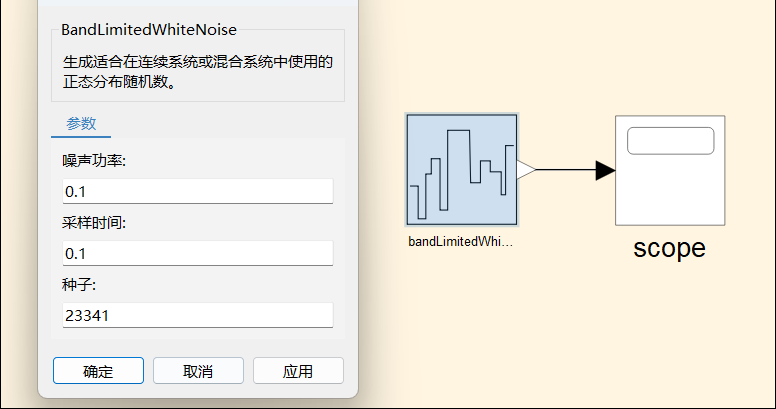 - Scope 模块:显示输入信号曲线。示例中,Scope 模块显示 BandLimitedWhiteNoise 模块生成的噪声信号。