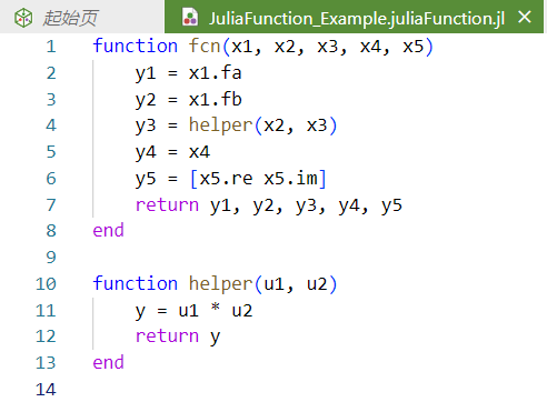 双击 JuliaFunction 模块, Syslab 窗口将弹出并打开 Julia 函数脚本。您可在该脚本文件中定义多个 Julia 函数,其中第一个函数将被视作对应 JuliaFunction 模块的主函数,其他函数均被视作服务于主函数的辅助函数。