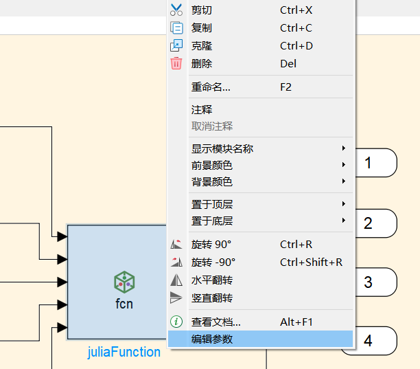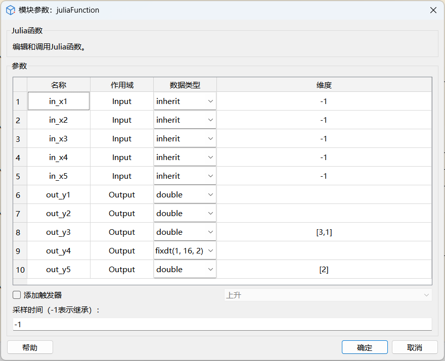 选中 JuliaFunction 模块,右键单击并在下拉菜单中选择编辑参数,在对话框中配置输入输出端口维度与数据类型。