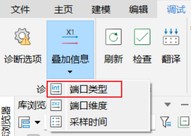 要显示一个模型中所有信号的数据类型,在调试选项卡下单击叠加信息,选择端口类型选项。