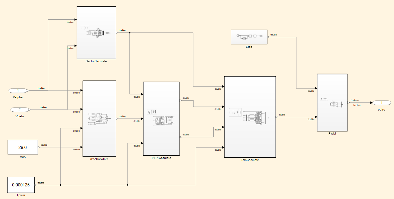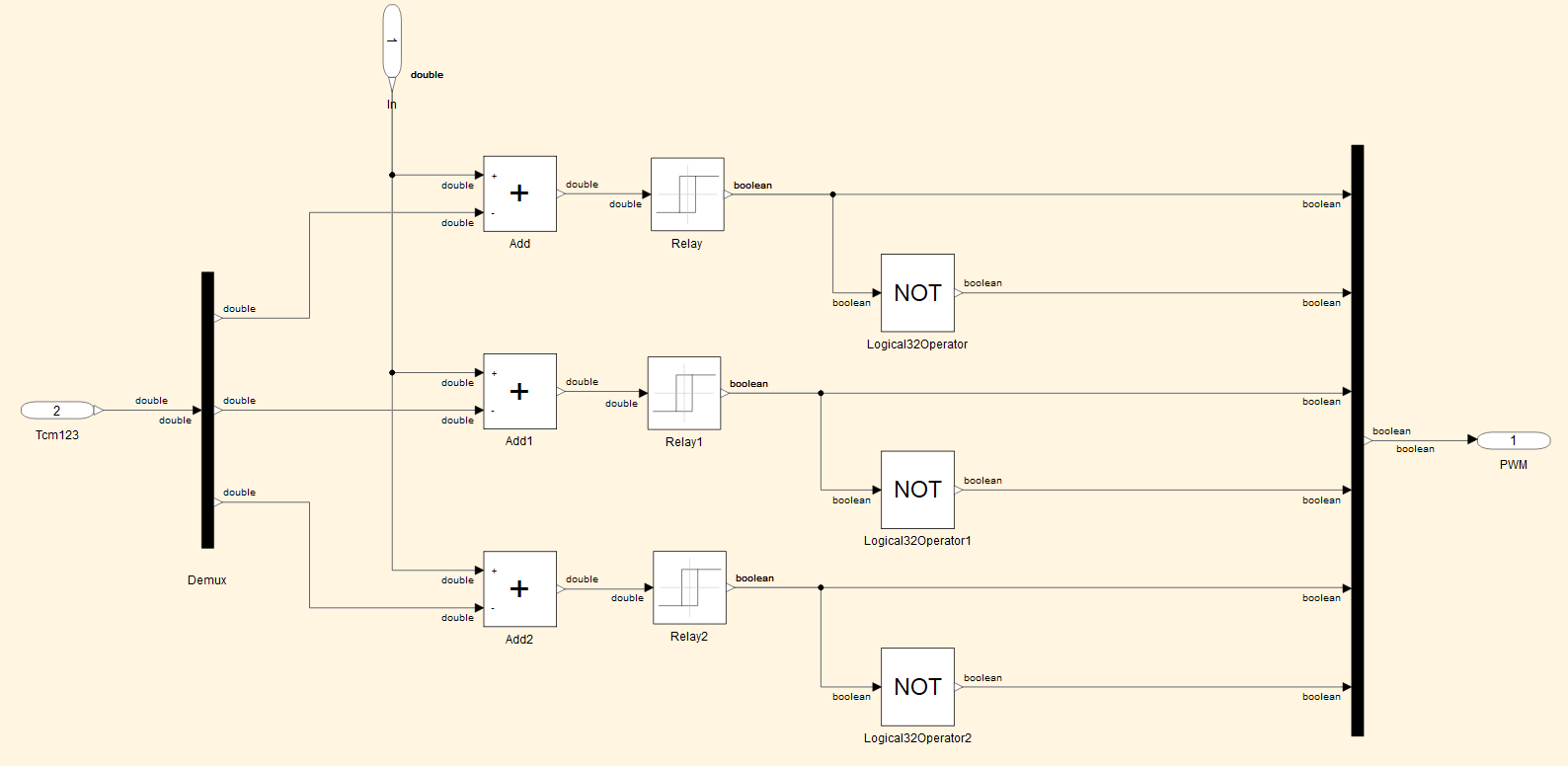 模型将在信号线旁显示数据类型,大多数信号均为双精度,只有名为 PWM 的子系统输出例外。双击 PWM 子系统进行调查。