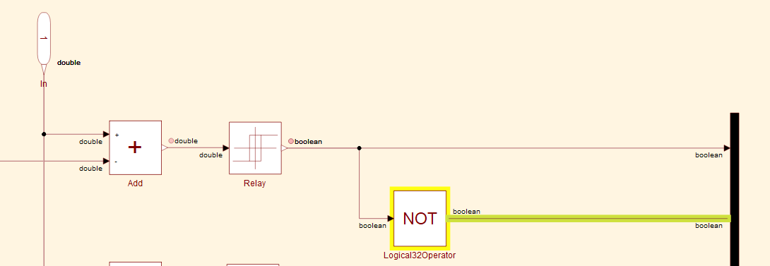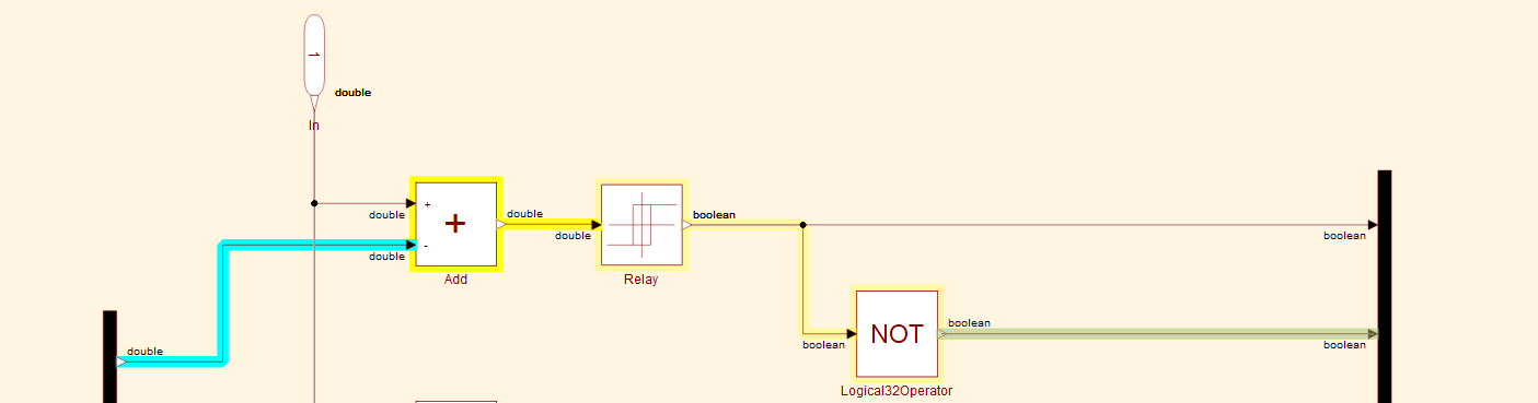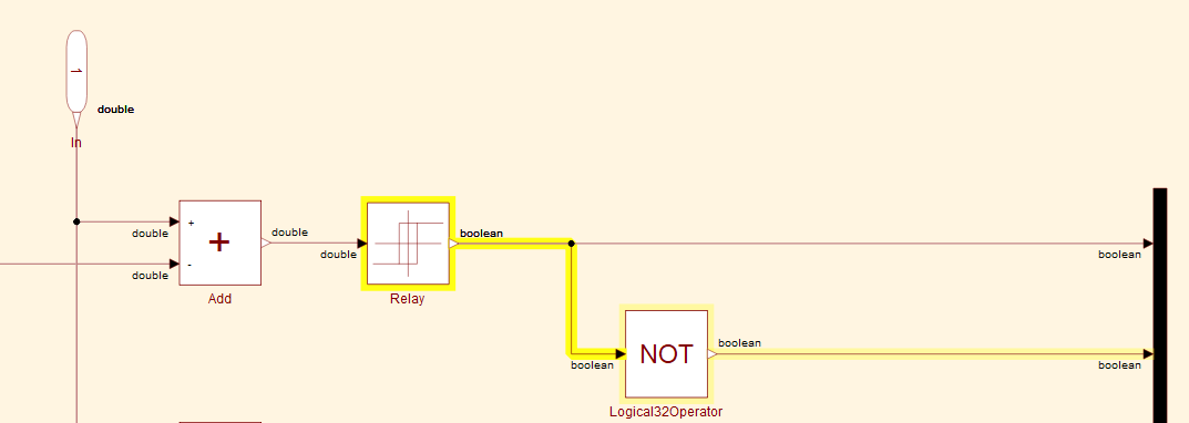 Relay 组件将信号从双精度转换为布尔类型。可以通过 Relay 模块的参数对话框设置输出数据类型,也可以使用 Sysblock 模块库内的 TypeConversion 模块。双精度(默认数据类型)提供最佳数值精度,是所有模块都支持的数据类型。双精度数据类型占用的内存和计算能力也最多。要对内存和计算能力有限的嵌入式系统建模,可使用其他数值数据类型。